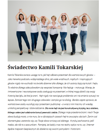 Kampania „Nie hejtuję – motywuję”, stworzona przez Ilonę Adamską, powstała jako odpowiedź na rosnący problem hejtu i przemocy słownej, zwłaszcza wśród młodzieży. Jej celem jest promowanie szacunku, empatii i pozytywnej komunikacji – w szkołach, firmach i codziennym życiu. Działania obejmują billboardy, warsztaty edukacyjne oraz motywacyjne spotkania, a inicjatywa przyciągnęła już tysiące uczestników i wielu ambasadorów świata kultury i mediów.